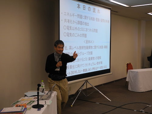 冒頭、『高レベル放射性廃棄物やそれを取り巻く現状を皆様に知っていただき、次世代を担う子供たちと一緒に考える授業づくりを考えていただきたい』という趣旨説明が行われました。