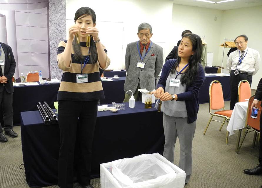 午後からは、NUMOより、「高レベル放射性廃棄物について」「高レベル放射性廃棄物の処分方法」「地層処分と日本の地下利用」「諸外国の状況」などについて説明が行われました。さらに、物質を閉じ込めるガラスの性質を理解する実験や、粘土の粒子が水を吸って膨張する実験なども行われました。続いて、中学校の先生によるエネルギー環境学習の実践事例の紹介があり、その授業で利用された実験キット「はかるくん」を全員で体験。放射線の測定も行いました。