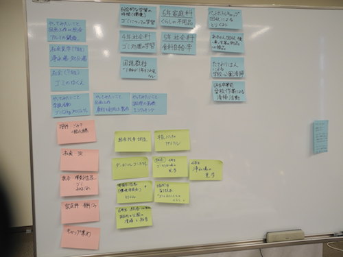 参加者の皆さんは「小学校」「中学校」「大学」「小・中・高・大混合」の4グループに分かれて議論を行いました。午前中のワークショップで共有したエネルギー環境学習やゴミ問題などの様々な学習単元を、どのように結びつけるか、授業目標をどのように設定するか、などのアイディアを発表していただきました。