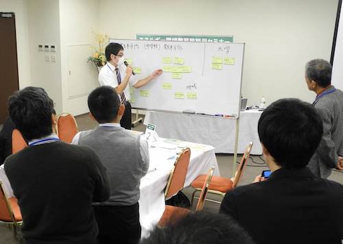 長崎大学教育学部 藤本登教授の進行に添って、エネルギー問題やゴミ問題を、どの校種のどの場面で扱っているか、参加者どうしで共有するワークショップが行われました。