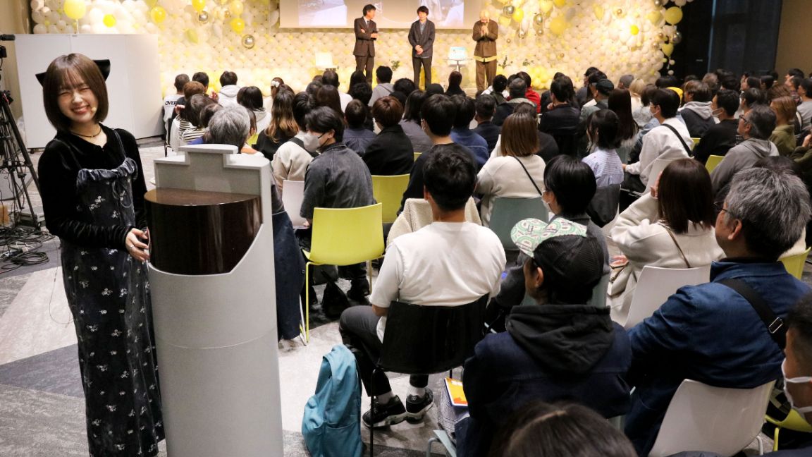 会場に用意されたパソコンに、原子力発電環境整備機構(NUMO)のマスコットキャラクター「グーモ」が“先生役”で登場。なえなのさんがパソコンを操作し、画面に表示されるグーモのメッセージを読み上げながら、三四郎の2人と地層処分を基礎から学び、聴講した若い人たちとともに理解を深めました。NUMO理事長の山口彰も解説に加わりました。