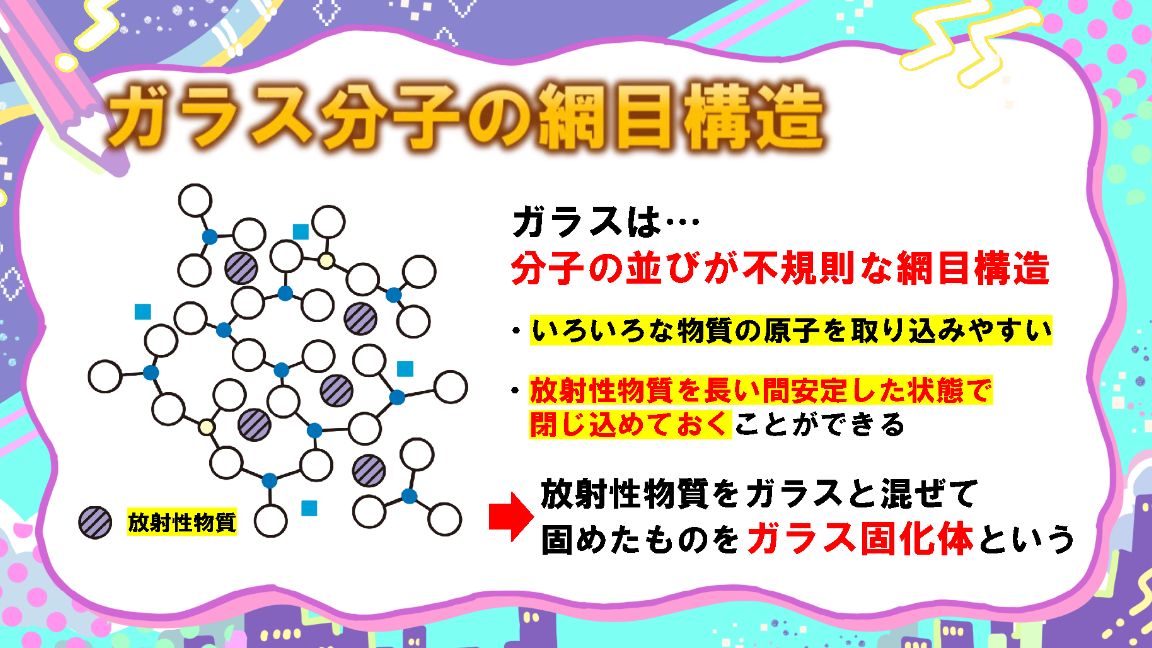 山口 ガラスは構造が不規則な網目状なので、いろんな粒子を取り込んで閉じ込める特長があるんです。このため、放射性物質を長い間、安定した状態で閉じ込めておくことができます。放射性物質をガラスに閉じ込めたものを「ガラス固化体」といいます。