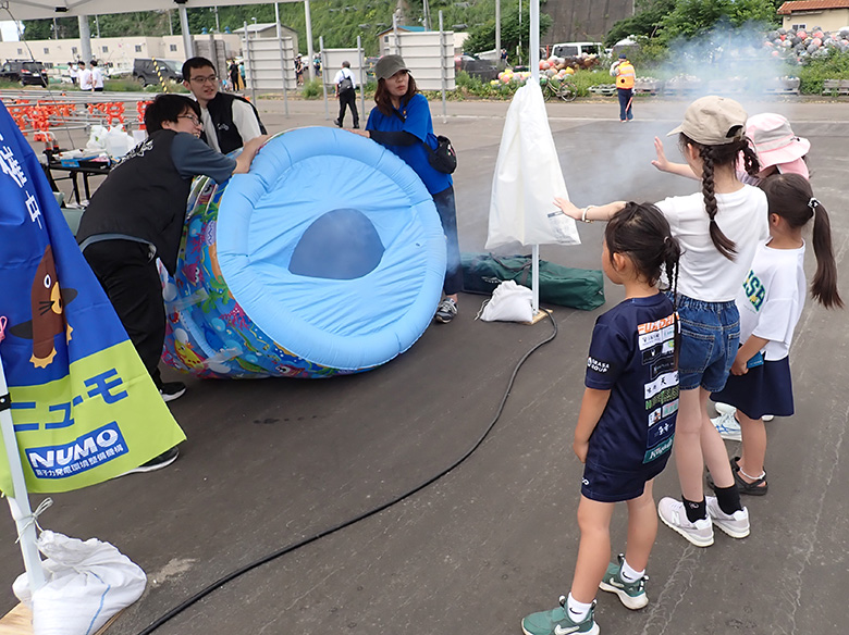 7月6日の神恵内村「かもえない沖揚げまつり」には、神恵内交流センターを中心とするNUMO職員が今年も運営スタッフとして参加しました。新たな取り組みとして、東京大学のサイエンスコミュニケーションサークルCASTの協力を得て、偏光板を用いた工作や空気の力や流れを学べる「空気砲」によるサイエンスショー等を実施しました。