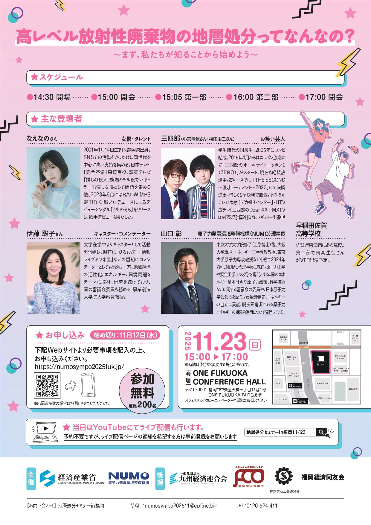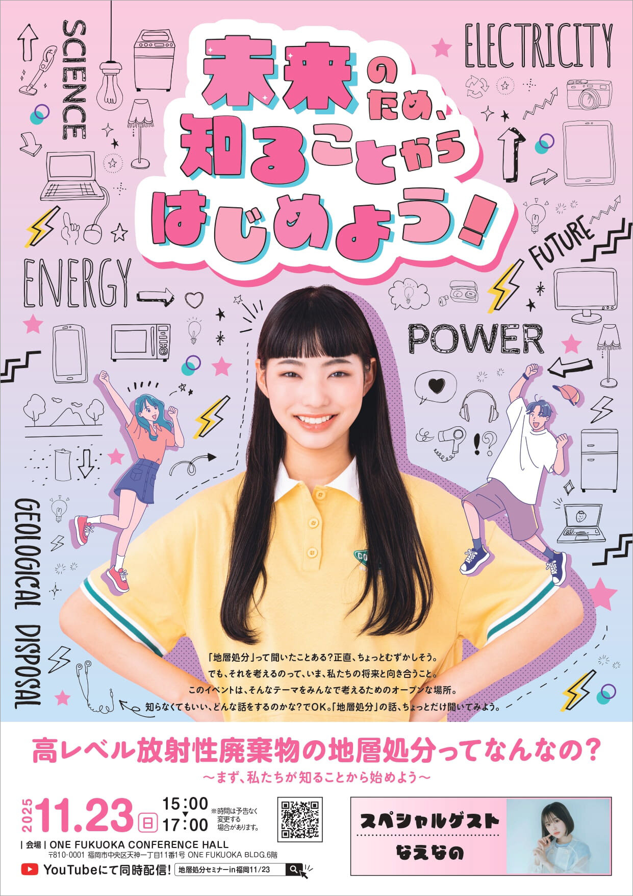 本セミナーでは、女優・タレントのなえなのさんが「地層処分ってなんなの?」という疑問について、ご来場の皆さんやお笑い芸人の三四郎さん、キャスター・コメンテーターの伊藤聡子さんと一緒に楽しく学んで、考えを深めていきます。